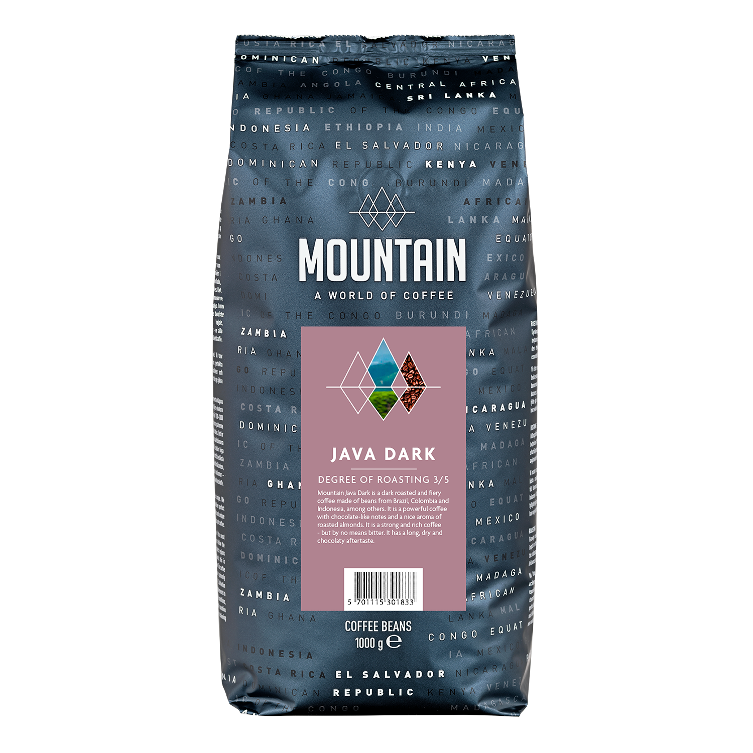 - Mountain Java Mørk er en mørkristet og fyrig kaffe sammensat af bønner fra blandt andet Brasilien, Colombia og Indonesien. Det er en kraftig kaffe med chokoladeagtige toner. En lækker kop kaffe hvor duften leder tankerne hen på brændte mandler. Det er en kraftig og fyldig kaffe – dog uden at være bitter. Den har en lang, tør og chokoladeagtig eftersmag.