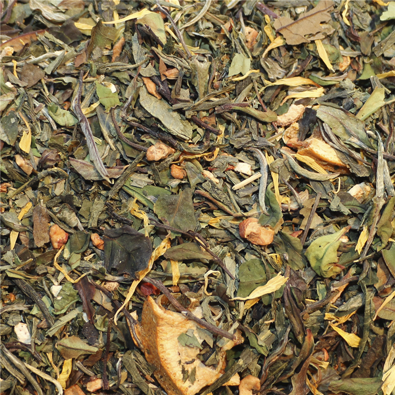 Grøn te(38%), hvid te(32%), tørret æble(10%), tørrede appelsinskiver(10%), orangeskaller(7%), aroma, morgenfrueblomster