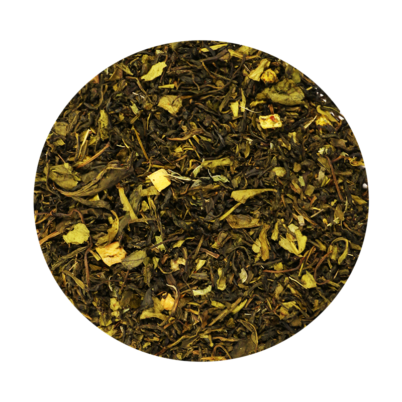 Grøn Ceylon te*(68%), hvid Ceylon te*(20%), skåret citron verbena*, naturlig citron, brombær, mango og passionsfrugt aroma, chili*, mangostykker*(0,8%) og ferskenstykker*(0,8%) *=økologisk
