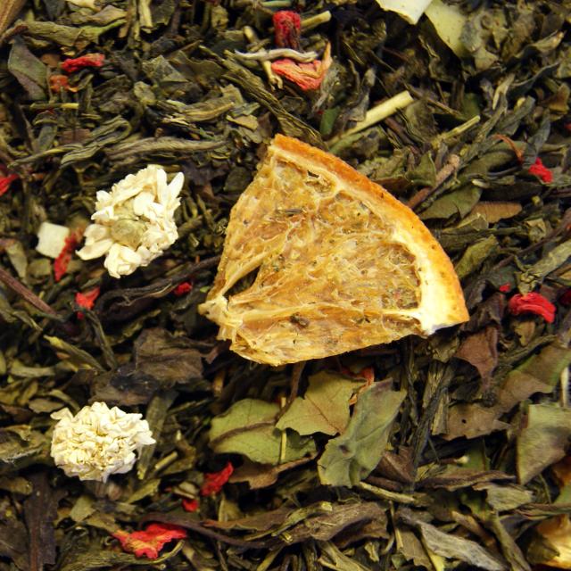 Grøn Sencha te(66%), Pai Mu Tan hvid te(20%), appelsinskiver(5%), kokosflager (3%), saflorblomst og/eller morgenfrueblomst(2%), romersk kamille (2%) og aroma.