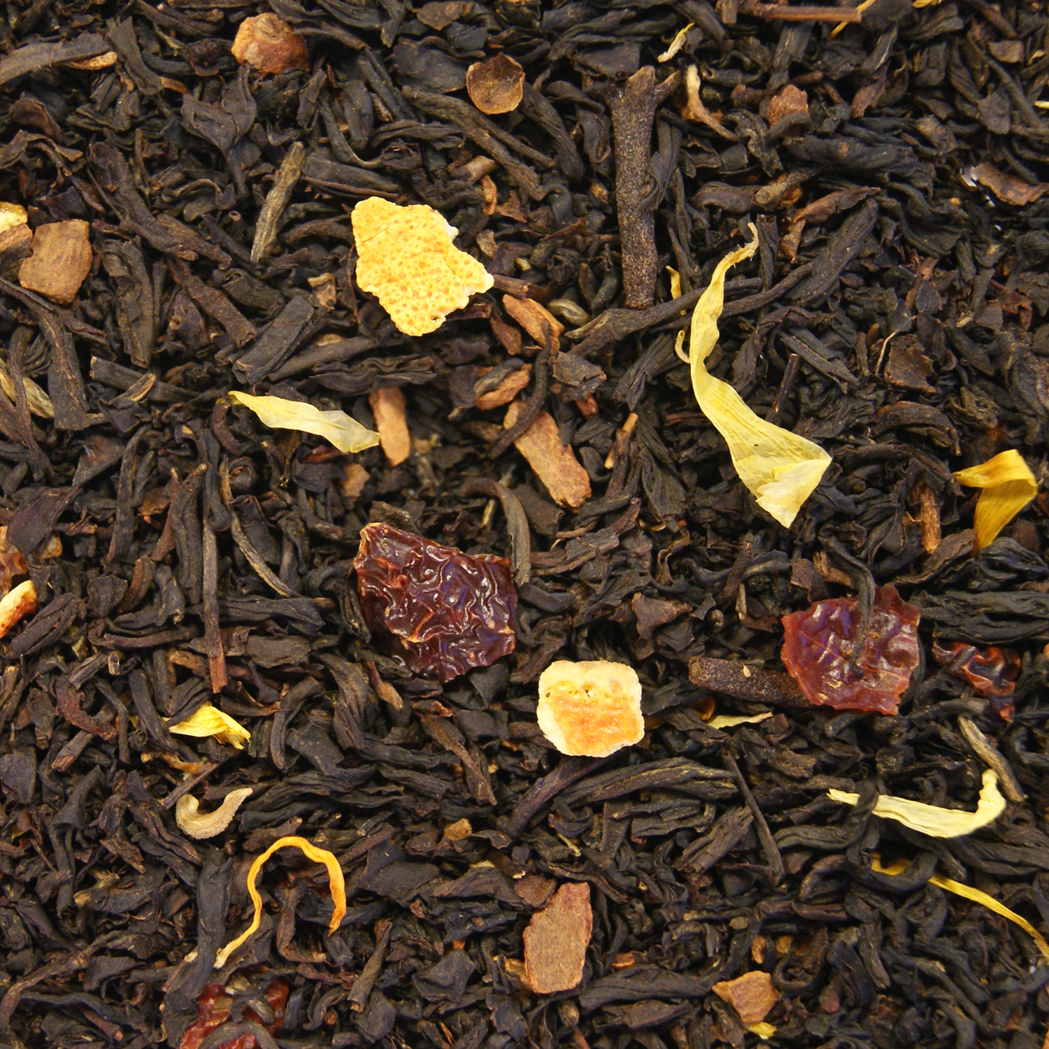 Sort te (82%), hybenskaller (5%), orangeskaller, kanelstykker, hele nelliker, morgenfrueblomster og aroma.