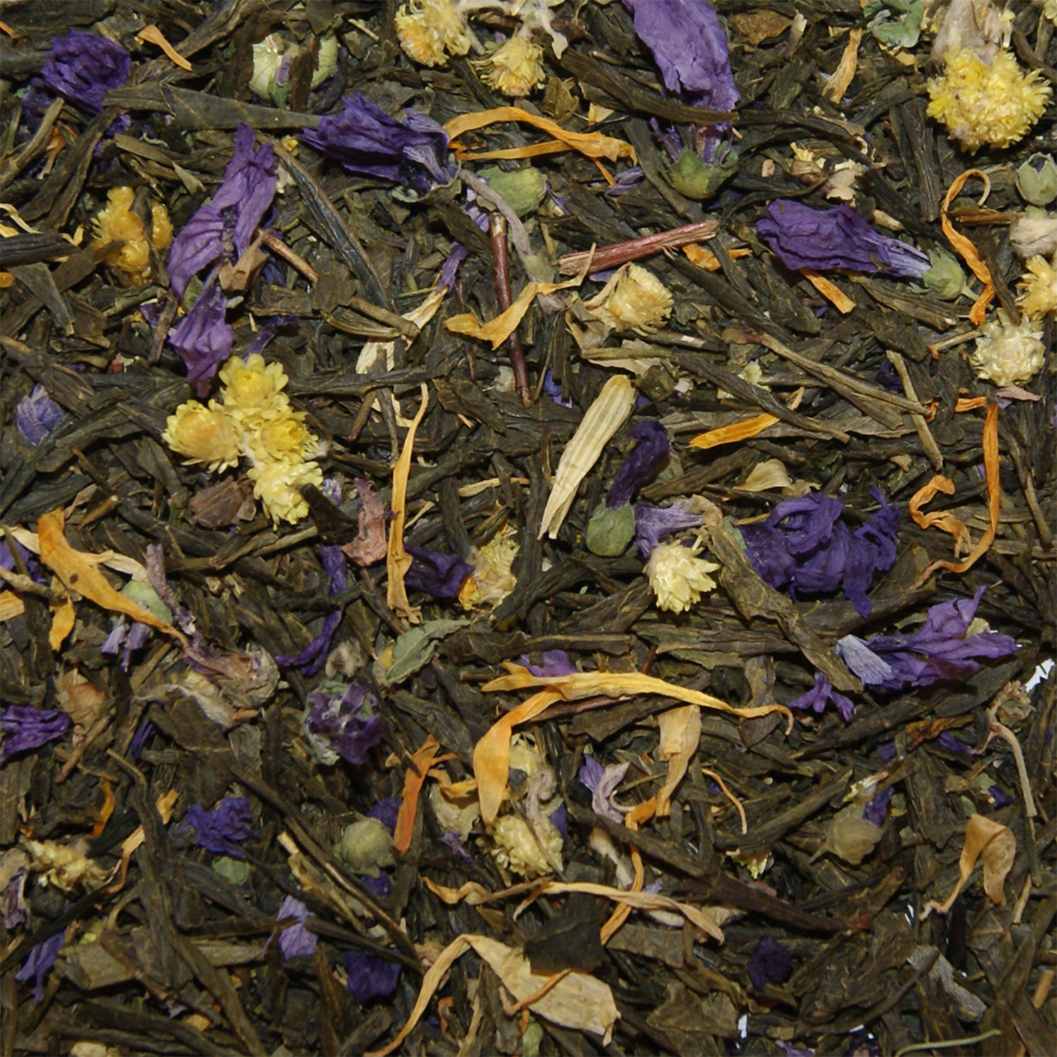 - Frisk te, som er mild og sødlig. En flot te med lilla og gule farver som giver forårsfornemmelser.
