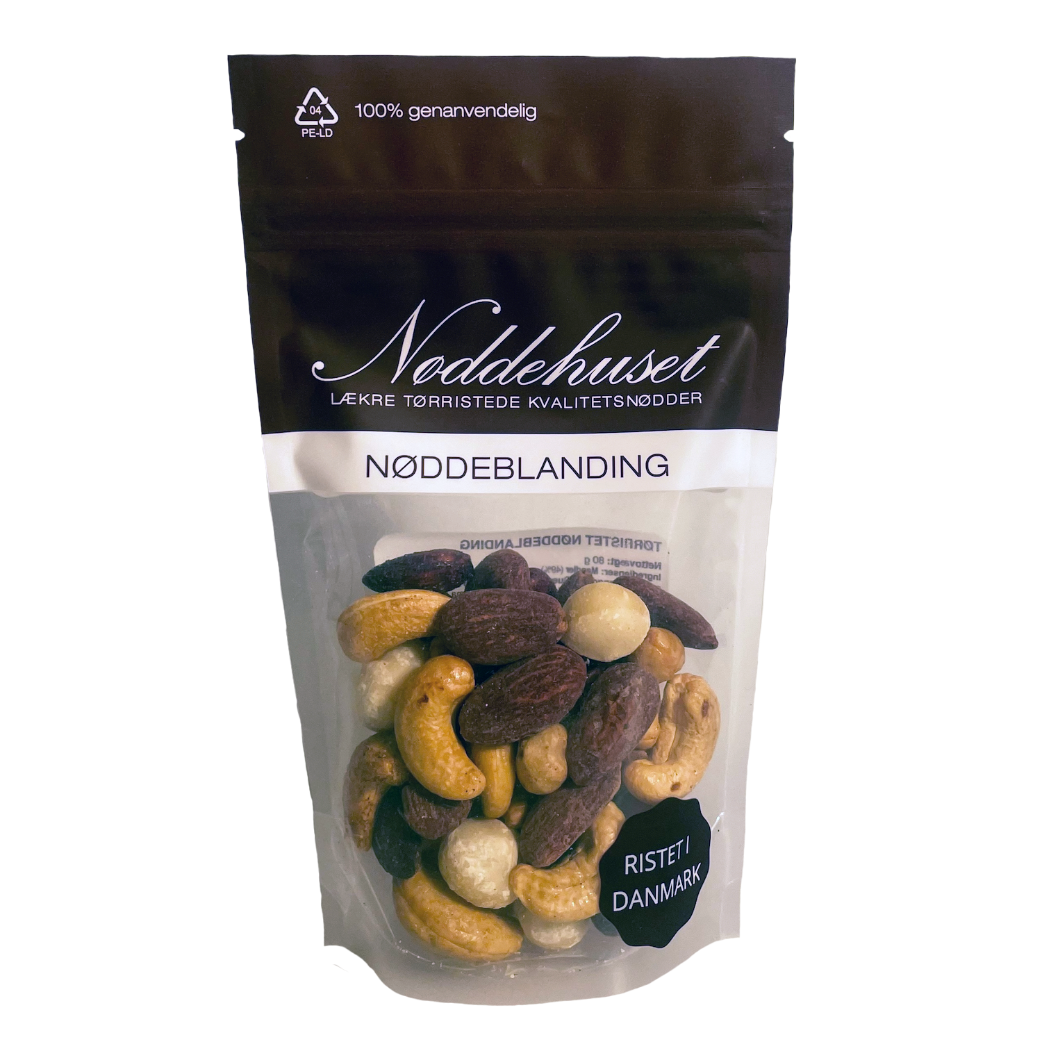 - Nøddehusets 5 mest populære nødder i en skøn blanding: Saltede mandler, saltede cashewnødder, mandler med røgsmag, hasselnødder og saltede macadamia. God at dele med andre om eftermiddagen eller til en hyggestund derhjemme. Posen kan også lukkes igen, hvis du hellere vil gemme nødderne til dig selv. Alle nødderne er selvfølgelig tørristede, så de kan nydes med god samvittighed. "