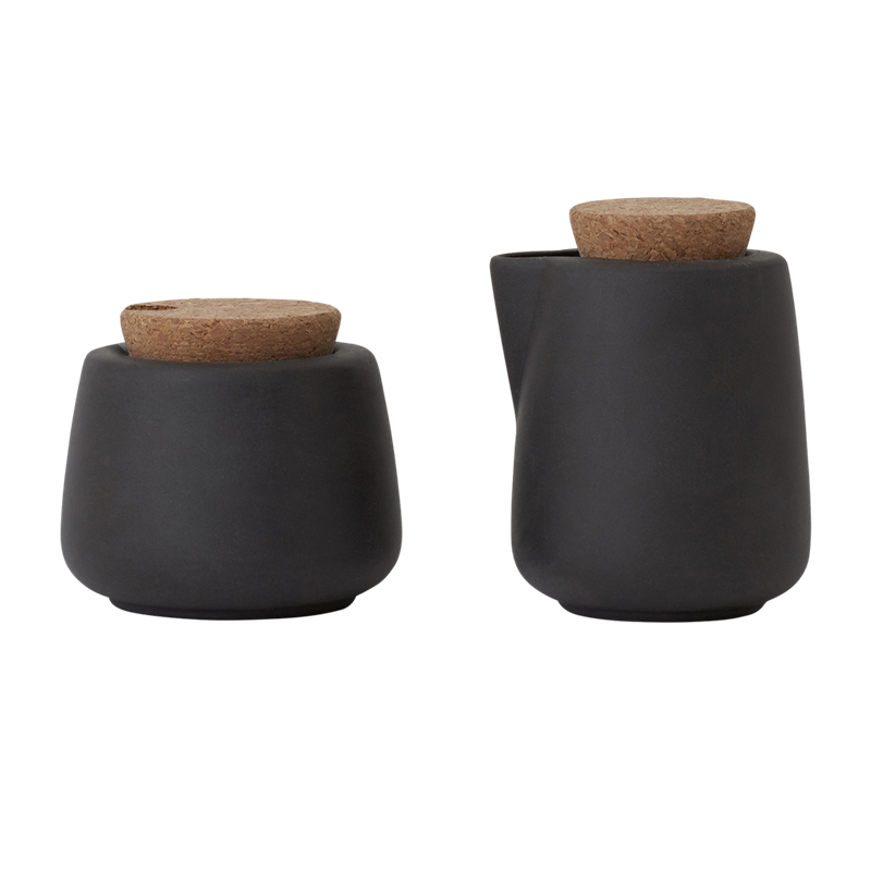 - Hvis æstetik er vigtig, så er sættet her - helt fantastisk! Sættet består af den fineste mælkekande og sukkerskål i farven kul. Mat og dyb i farven og med korklåg på begge.