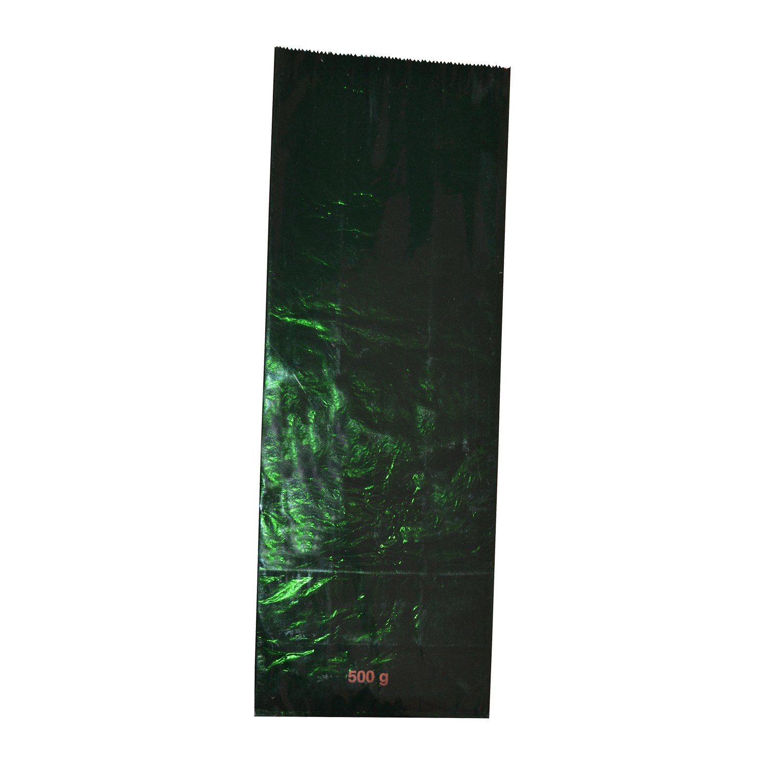 Mørkegrøn pose med cellofanoverflade med påtryk "500 g" - måler 105 x 285 x 65 mm.