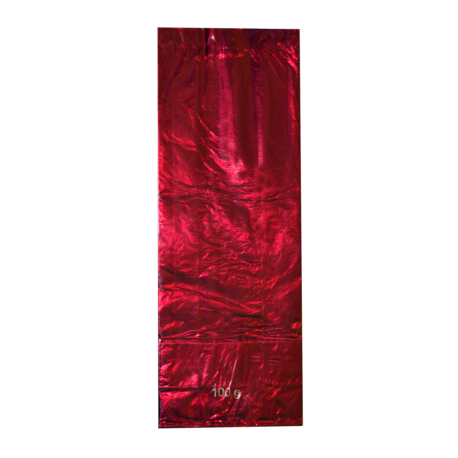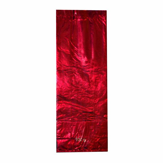 - Rød pose med cellofanoverflade med påtryk "100 g" - måler 70 x 190 x 40 mm.