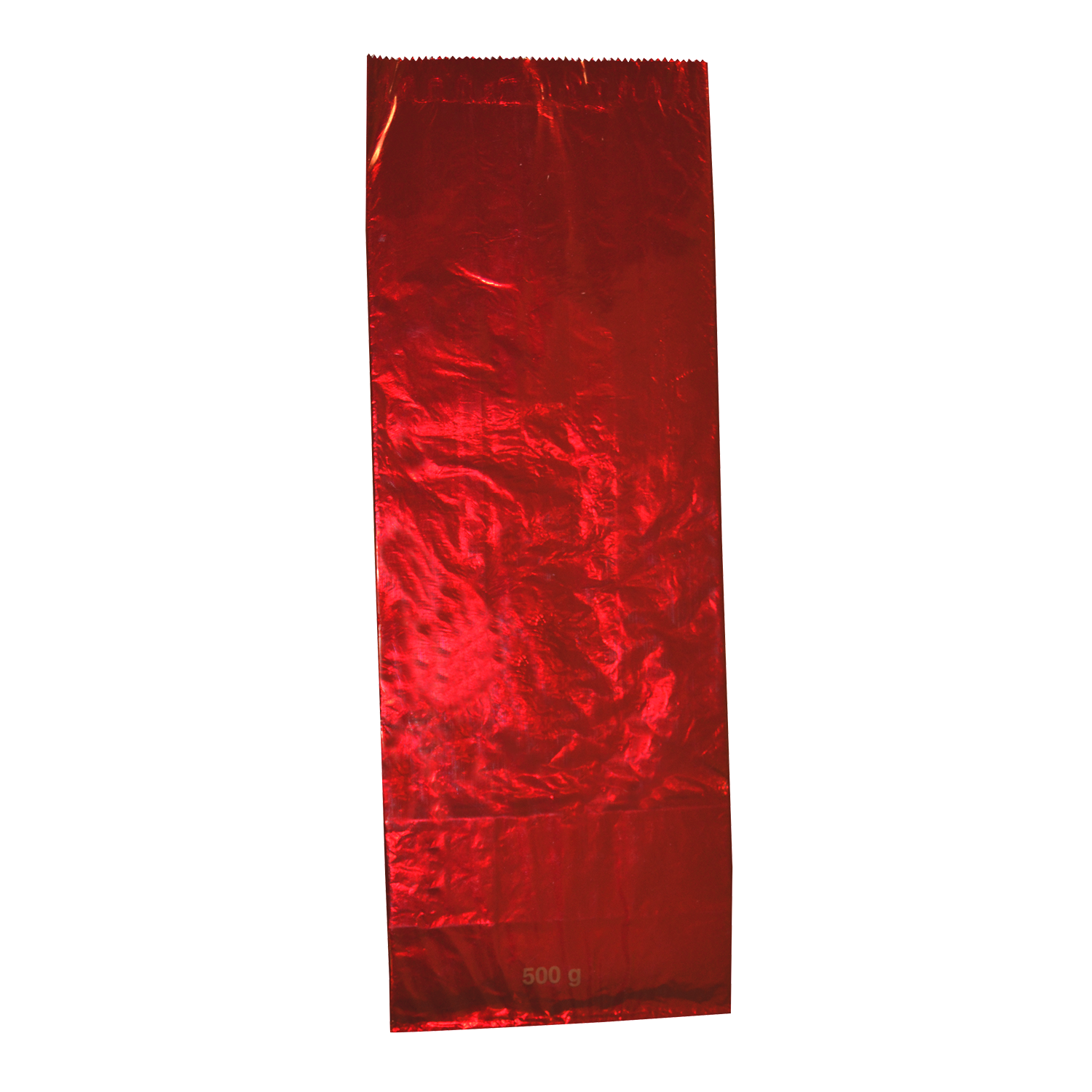 - Rød pose med cellofanoverflade med påtryk "500 g" - måler 105 x 285 x 65 mm.