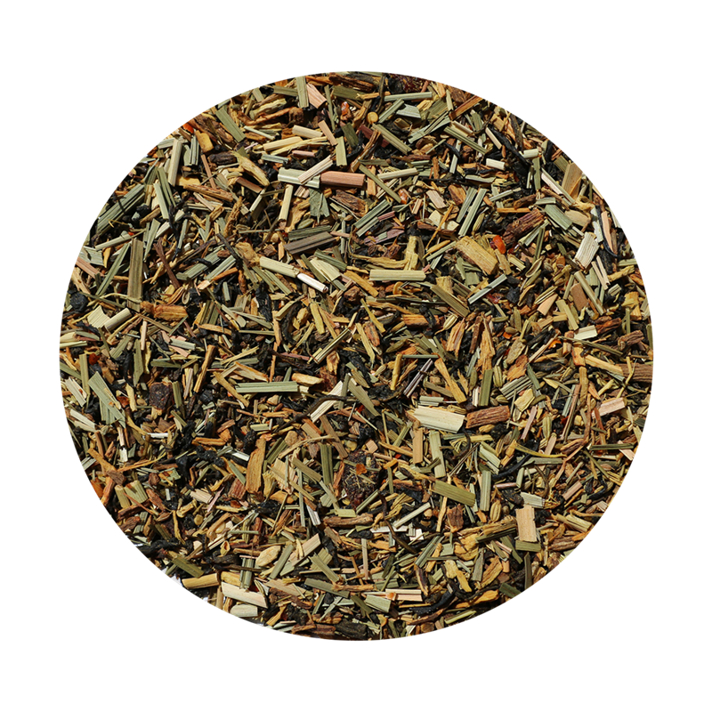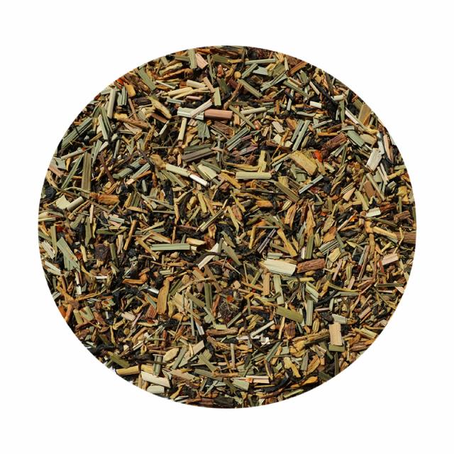 Lakridsrod, skåret*, grøn te*(21,5%), lemongræs*, hel grøn anis*, hel fennikel*, goji bær*, chili*, naturlig citron aroma og naturlig anis aroma *=økologisk.