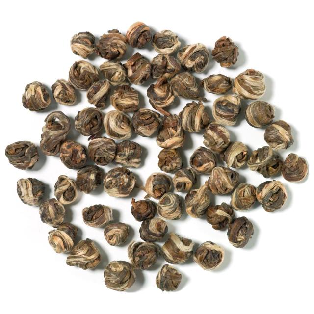 - Håndrullede små perler af te med en fortryllende duft og smag af friske jasminblomster.