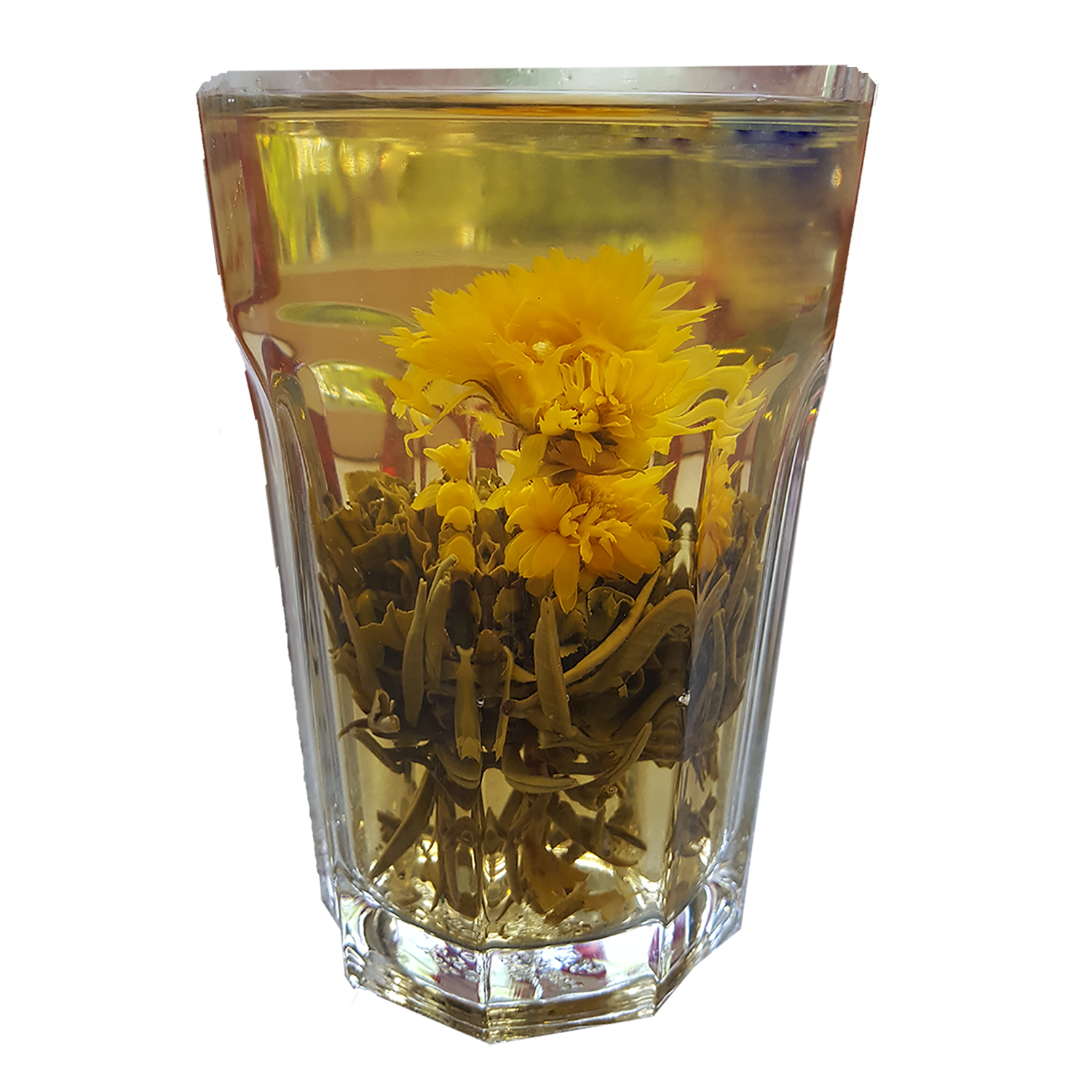 - Grøn te, håndbunden rundt om gul morgenfrue og med mild smag af jasmin. Disse te blomster er håndbundne med den eksklusive Jasmin Silver Needle te og gul morgenfrueblomst. Vi anbefaler at brygge i glas eller glaspotte, for at få den flotte visuelle oplevelse, når blomsten folder sig ud. Te blomsten bliver i glasset mens denne drikkes. Der kan påfyldes vand yderligere 1-2 gange pr. blomst.