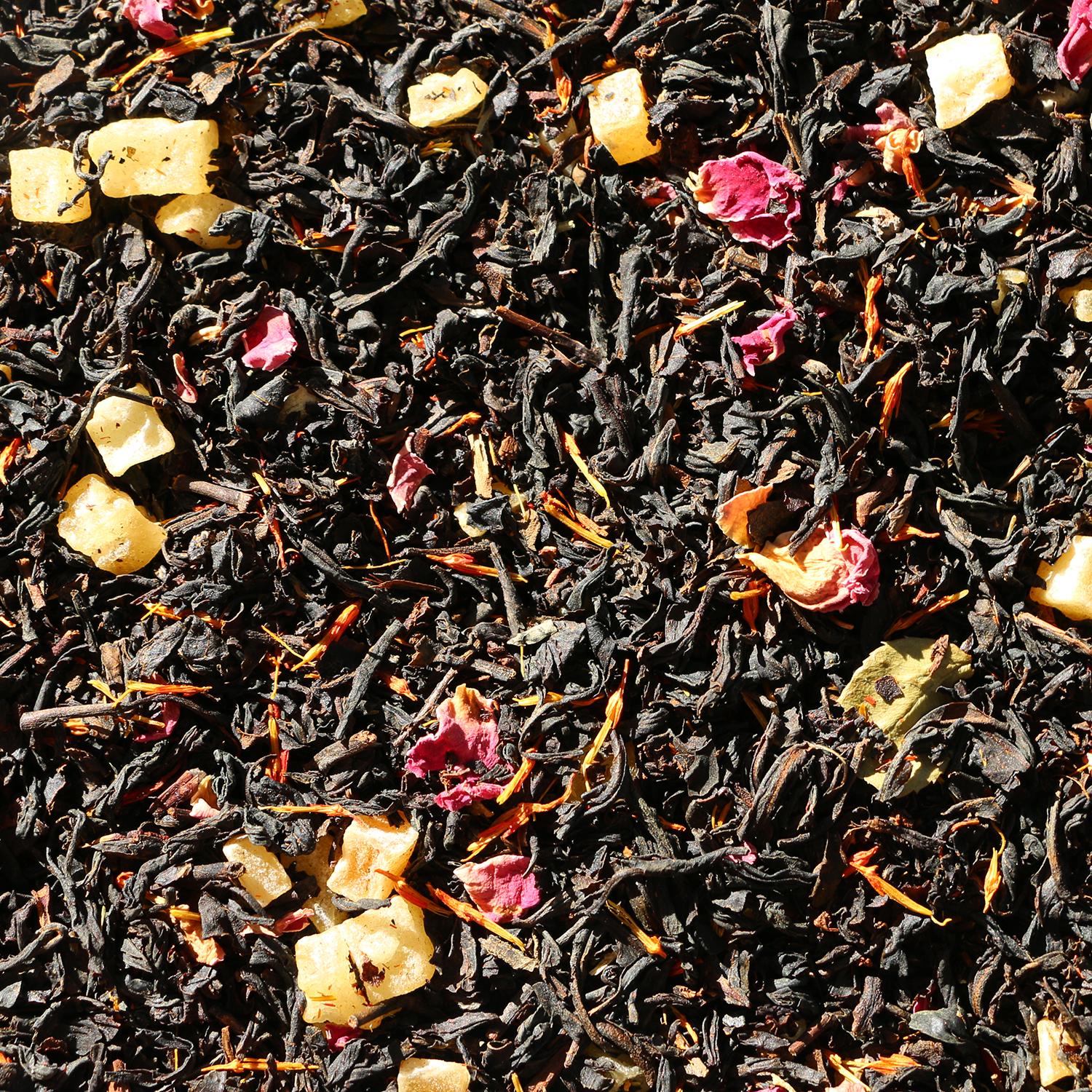 Sort te (69%), kandiserede papaya stykker (12%), kandiserede mango stykker(12%), aroma, saflorblomst og/eller morgenfrueblomst, rosenblade og frysetørrede jordbærstykker