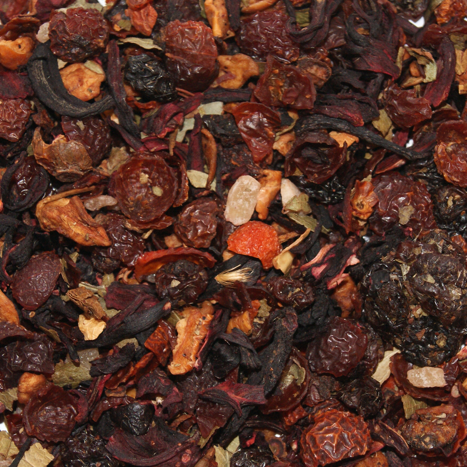 Hybenskaller (35%), hibiscusblomster, korender (korender, solsikkeolie) (17%), tørrede æblestykker (14%), kandiseret ananas (7%) (tørret ananas, sukker, surhedsregulerende middel: E330), frysetørrede solbær (3%), jordbærblade og aroma.