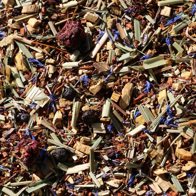 Lakridsrod(30%), grøn rooibush (21%), honey bush (15%), rooibush (13%), citrongræs (13%), aroma (2,4%), frysetørrede blåbær(2%), brombær(1,2%) og blå kornblomster (1%).