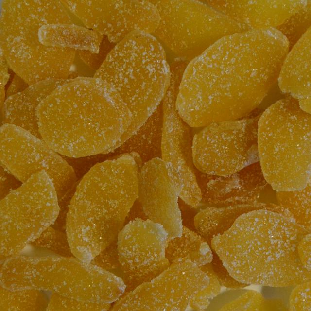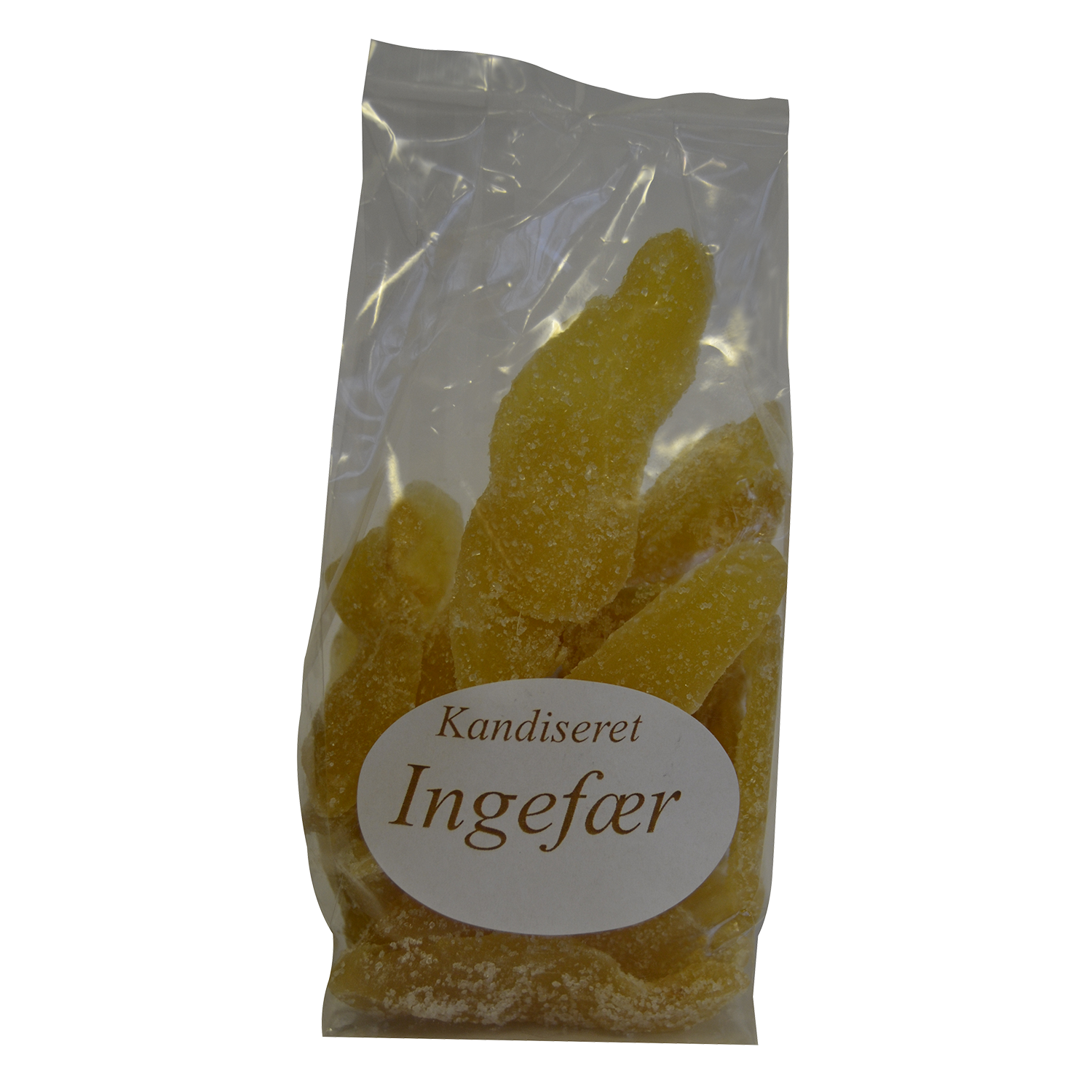 Kandiseret ingefær (ingefær, sukker, konserveringsmiddel: E223 (Natriumdisulfit)).